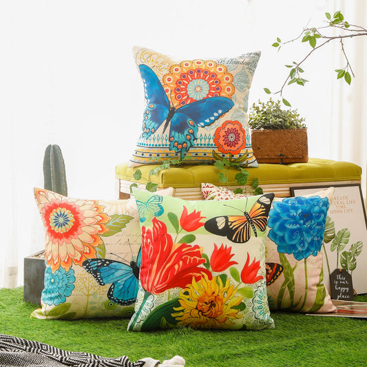 Colourful Flower and Butterfly Print Waterproof Cushion Cover - Design 1 (Set of 4 - 45x45cm)